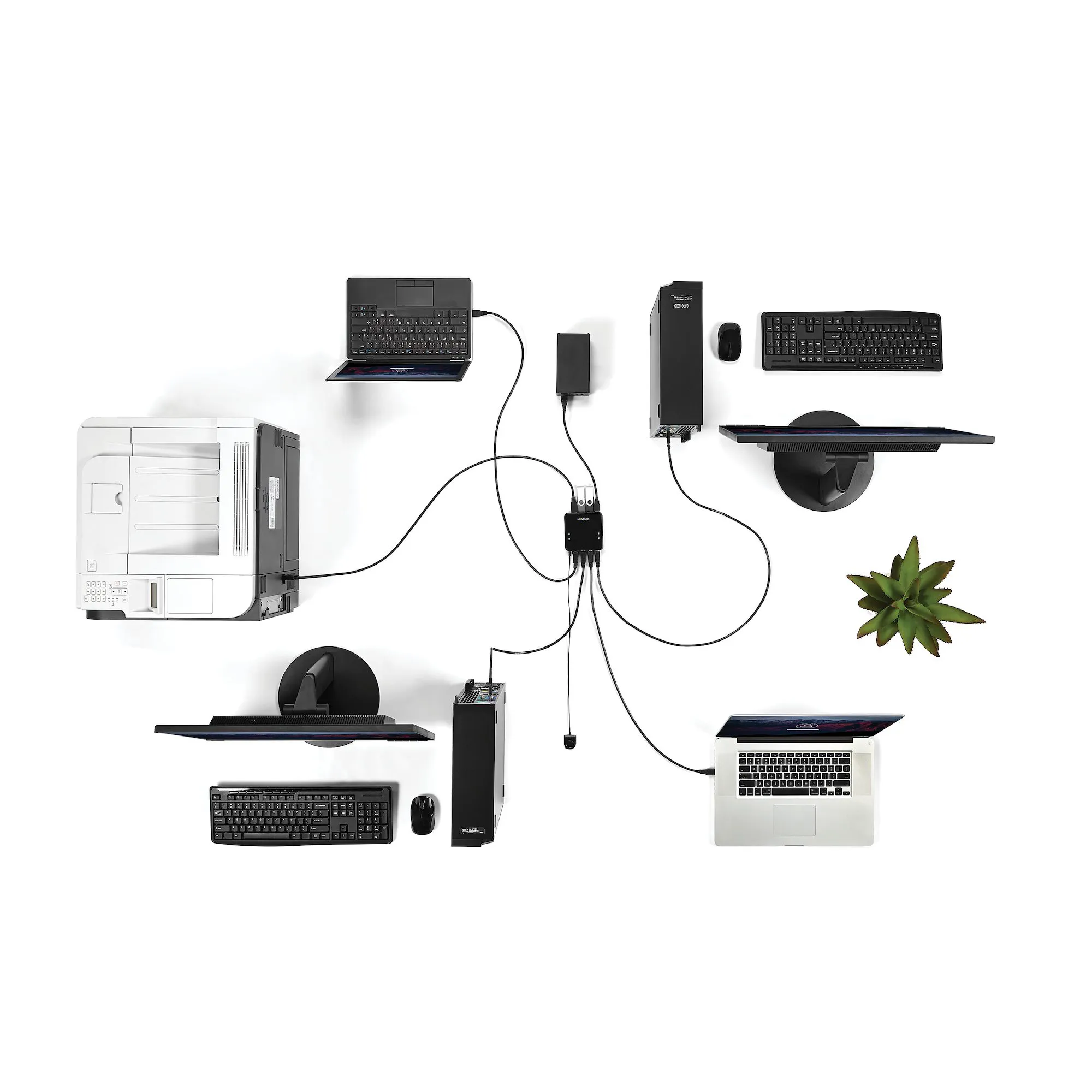 Evite los gastos de adquirir periféricos duplicados mediante el uso compartido de dispositivos (como impresoras, unidades portátiles de disco duro, ratón y teclado USB), con hasta cuatro computadores. Este conmutador USB también evita tener que cambiar de cable entre un sistema y otro, lo cual le ahorra tiempo y esfuerzo.